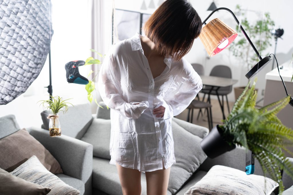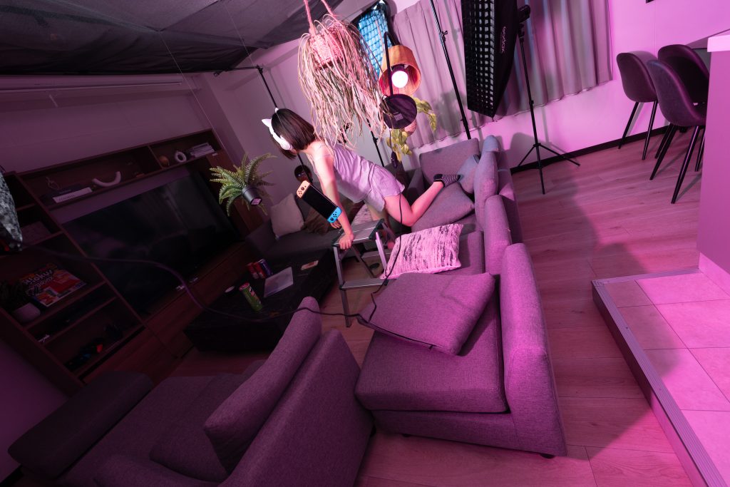 Nintendo Switch、コントローラー、観葉植物、ランプシェード。これらすべてを、細いテグスで天井やライトスタンドから吊るしました。 風で揺れないよう、テグスのテンションや固定方法を試行錯誤。モデルの今野苺さんの動きに合わせて、小道具が最適な位置に来るよう調整を重ねました。